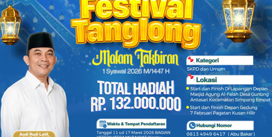 KABARTANAHBUMBU.COM, TANAH BUMBU – Pemerintah Kabupaten Tanah Bumbu akan menggelar Festival Tanglong untuk memeriahkan malam takbiran Idulfitri 1447 Hijriah atau 2026 Masehi. Kegiatan tahunan tersebut terbuka bagi peserta dari unsur Satuan Kerja Perangkat Daerah (SKPD) maupun masyarakat umum dengan total hadiah yang disiapkan mencapai Rp132 juta.